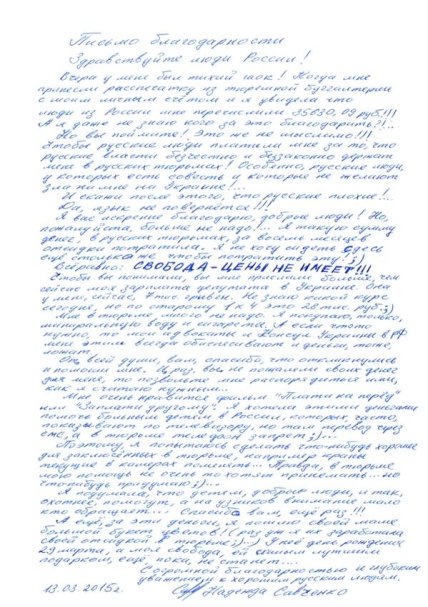 В письме Н.Савченко сообщила, что граждане России перечислили на ее счет 35630,09 руб. Она выразила слова благодарности и написала, что "свобода цены не имеет".