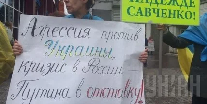 Участники антивоенного пикета держат в руках плакаты: "Свободу Надежде Савченко", "Мариуполь - это Украина", "С войной надо заканчивать", "Агрессия против Украины, кризис в России - Путина в отставку!".