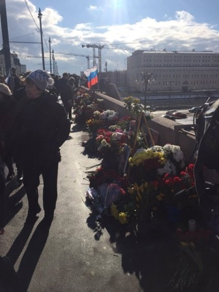 Многие собравшиеся держат в руках цветы, которые намерены возложить на Большом Замоскворецком мосту, где год назад убили политика.