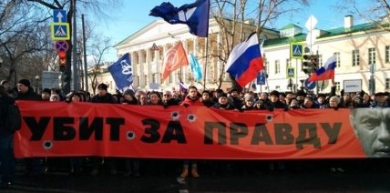 Возглавляют колонну лидеры российской оппозиции Михаил Касьянов, Илья Яшин, Владимир Милов, Дмитрий Гудков, Владимир Кара-Мурза-младший, которые идут, держа в руках большой черный баннер с надписью красным цветом: "Убит за свободу".
