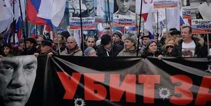 В центре Москвы тысячи людей вышли на Марш памяти российского оппозиционера Бориса Немцова, убитого год назад.