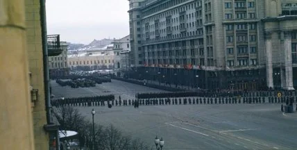 С балкона американского посольства он заснял, как сотни солдат образуют длинный коридор, по которому на Красную площадь выносят гроб с телом Сталина.