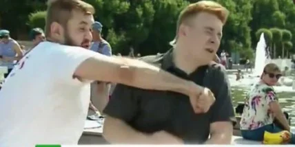 Журналист телеканала, известного своими пропагандистскими сюжетами об Украине, вел репортаж из парка Горького в Москве, где десантники праздновали День ВДВ. Во время прямого включения к нему подошел мужчина явно навеселе, нецензурно выражавшийся и кричавший, что Россия захватит Украину. Когда корреспондент в вежливой форме попросил его помолчать, тот сильно ударил его по лицу, добавив, что с ним нельзя так разговаривать.