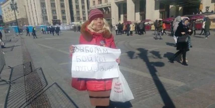 На Манежной площади в центре Москвы во время пикета против выборов задержана кубанская активистка Дарья Полюдова из-за ленточки в цветах украинского флага у нее на одежде.