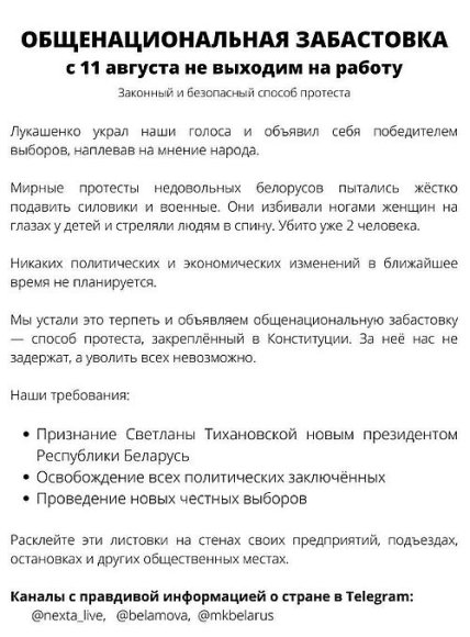 07:54 Telegram-канал NEXTA, ставший рупором протестующих, публикует призыв к национальной забастовке с сегодняшнего дня.