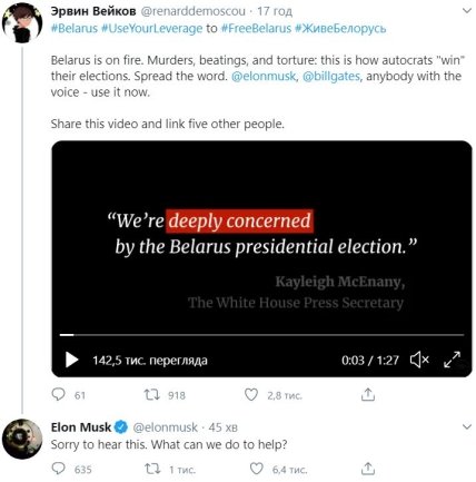 13:30 Илон Маск спрашивает, чем может помочь беларусам.