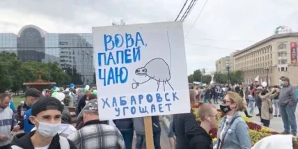 Люди скандировали "Путин, выпей чаю", проходя маршем по главной улице Хабаровска, имея в виду отравление Навального (по мнению штаба оппозиционера, ему могли подсыпать яд в чай – ред.).