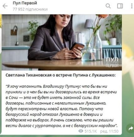 Как передает Telegram-канал "Пул Первой", Тихановская назвала Лукашенко нелегитимным президентом и предостерегла Путина от любых договоренностей с ним.