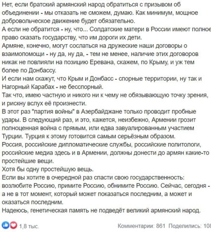 "Нет, если братский армянский народ обратиться с призывом об объединении - мы отказать не сможем, думаю. Армяне, конечно, могут сослаться на дружеские наши договоры о взаимопомощи - ну да, ну да, - тем не менее, наличие этих договоров никак не повлияли на позицию Еревана, скажем, по Крыму, и уж тем более по Донбассу.