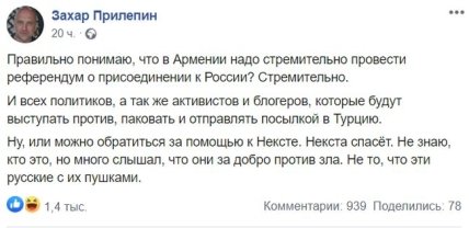 "Правильно понимаю, что в Армении надо стремительно провести референдум о присоединении к России? Стремительно", — написал Прилепин.