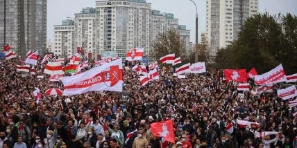 Большая колонна протестующих с бело-красно-белыми флагами прошла по центральным улицам Минска. Tut.by оценивает число ее участников в несколько десятков тысяч, но подчеркивает, что точное количество подсчитать невозможно.