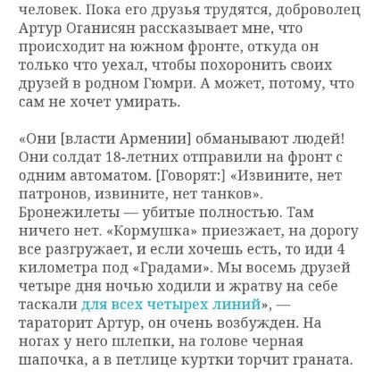 "Они [власти Армении] обманывают людей! Они солдат 18-летних отправили на фронт с одним автоматом. [Говорят:] "Извините, нет патронов, извините, нет танков". Бронежилеты — убитые полностью. Там ничего нет. "Кормушка" приезжает, на дорогу все разгружает, и если хочешь есть, то иди 4 километра под "Градами". Мы восемь друзей четыре дня ночью ходили и жратву на себе таскали для всех четырех линий", — говорит Артур, у которого на ногах шлепки, на голове черная шапочка, а в петлице куртки торчит граната.