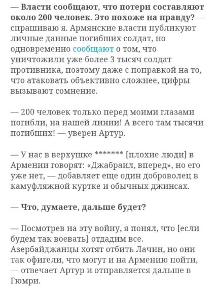 В своем репортаже о событиях в Нагорном Карабахе Азар приводит слова очевидцев. К примеру, доброволец Артур Оганисян рассказывал ему, что происходит на южном фронте, откуда он только что уехал, чтобы похоронить своих друзей в родном Гюмри. А может, потому, что сам не хочет умирать.