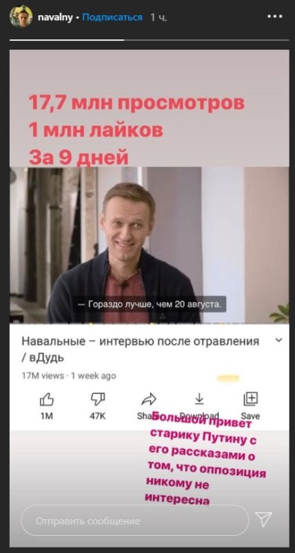 После введения санкций против России из-за отравления, Навальный записал сториз в Instagram, в котором "передал привет" Путину.