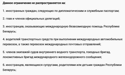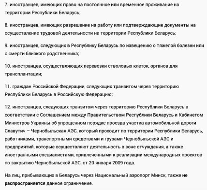 Власти страны предусмотрели несколько исключений. В первую очередь, границы останутся открытыми для иностранцев, которые прибудут в Белоруссию через аэропорт Минска. По земле в Беларусь смогут въехать, несмотря на запрет, все граждане России, которые следуют транзитом на родину. Кроме того, в страну по-прежнему будут пускать иностранцев с дипломатическими и служебными паспортами, глав и членов официальных делегаций, водителей транспортных средств, выполняющих международные перевозки и перевозки почты. То же касается членов экипажей внутреннего водного транспорта, поездных бригад и локомотивных бригад международного сообщения.