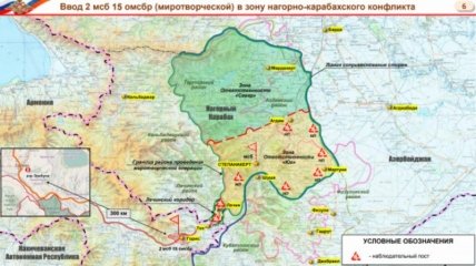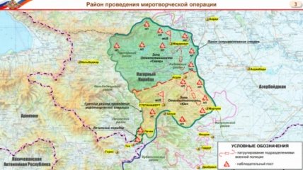 В российском Минобороны показали карту размещения своих миротворцев в Нагорном Карабахе.