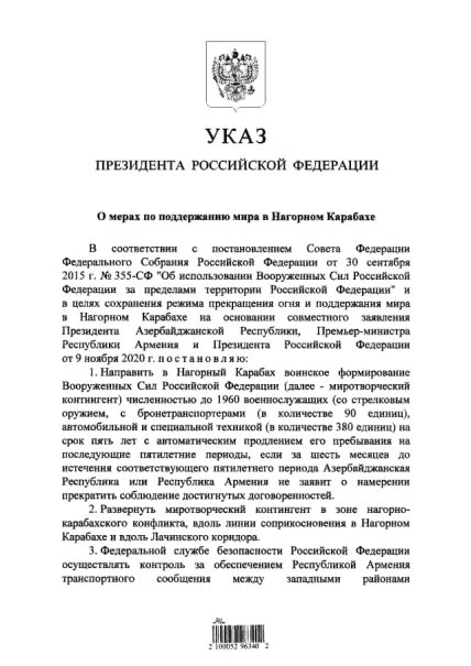 Ранее сообщалось, что миротворцы оборудуют в зоне карабахского конфликта 16 наблюдательных пунктов и будут сосредоточены в районе Лачинского коридора, который соединяет Карабах с Арменией. В путинском указе отмечается, что миротворческий контингент введен в Карабах сроком на пять лет.
