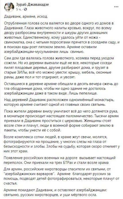 "Из деревни выехали ещё не все, некоторые соседи пилят плодовые деревья, другие разбирают дома, и грузят в старые ЗИЛы, всё что можно увести: крышу, мебель, оконные рамы, даже пол и тот отдирают, и увозят. Оставшиеся в деревне армяне обещали в десять вечера сжечь дотла ободранные дома, чтобы ни одно здание не досталось азербайджанцам даже в таком виде. Лишь пепелище", - написал он на своей странице в Facebook.