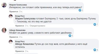 В комментариях под постом, Влад Росс добавил, что "Путин готовит свою дочь Екатерину Тихонову как своего приемника - но ему это не удастся. Путин жив и на него работают двойники".