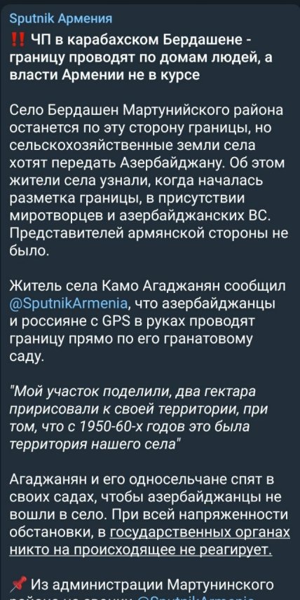 Напомним, что вчера ВС Азербайджана вынуждали жителей села Бердашен Мартунинского района Арцаха вопреки мирному соглашению сдать гранатовые сады, в то время как граждане сопротивлялись. Оказалось, что село останется по эту сторону границы, но сельскохозяйственные земли хотят передать Азербайджану. Об этом жители села узнали, когда началась разметка границы, в присутствии миротворцев и азербайджанских ВС. Представителей армянской стороны не было.