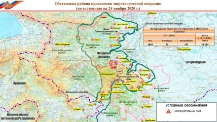 На карте видно, что под контролем "миротворцев" остается ряд городов – в частности, стратегически важный Шуша, а также Гадрут, Физули, Джебраил, Кубатлы и Зангилан. Также можно отметить, что большинство временных наблюдательных постов изменилась постоянными.