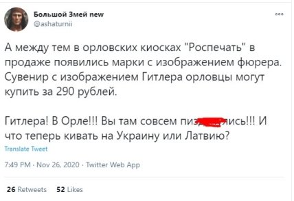 Марки в Орле продавали киоски "Роспечать" как сувениры, хотя этот город во времена Второй мировой два года провел в оккупации немцев и серьезно пострадал от них. На данный момент продукцию из продажи уже убрали.