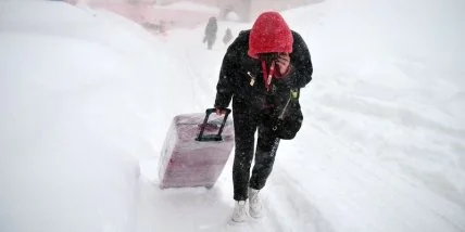 Жители города откапывают свои машины, огромные сугробы, заметенные снегом дорожные знаки.