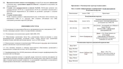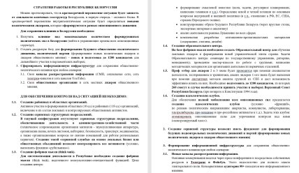 В нем отмечается, что для "сохранения влияния" необходимо в частности ввести своих людей в управляющие органы всех оппозиционных структур, создание собственного политического движения или партии, формирование своих каналов распространения информации, а также создание общественных организаций и сети лидеров общественной мысли.