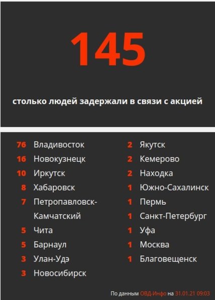 Так, в РФ на утро 31 января в митингах задержали 145 человек. Больше всего граждан задержали во Владивостоке (76), Новокузнецке (16), и Иркутске (10).