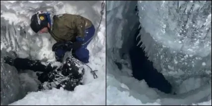 23 февраля на Эльбрусе произошло ЧП: двое сноубордистов во время катания на досках, провалились под снег и упали в яму на 4 метра, но чудом смогли зацепиться, повиснув над 15-метровой замерзшей расщелиной.