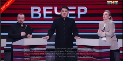 В России на канале "ТНТ" в комедийной передаче "Однажды в России" показали пародию на главных пропагандистов российского ТВ Владимира Соловьева, Дмитрия Киселева, Ольгу Скабееву и Артема Шейнина. Вскоре ролик был удален с YouTube и онлайн-кинотеатра Premier.