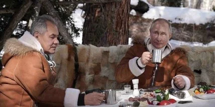 Президент РФ Владимир Путин и министр обороны страны Сергей Шойгу проводят выходные в Сибири, где катаются на гусеничных вездеходах и вроде как чаевничают на открытом воздухе.