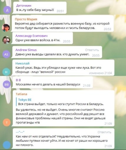 "На российском ТВ снова заговорили, что в Беларусь надо вводить российские войска. Раньше "братья" такое говорили про Украину. Кто не сделал выводов из нашей истории или соседей, пускай поторопится", - сообщается в телеграм-канале "Усы Лукашенко".