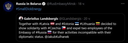 Посольство России в Беларуси отреагировало на высылку российских дипломатов из Балтийских стран использовав оскорбительный тег.