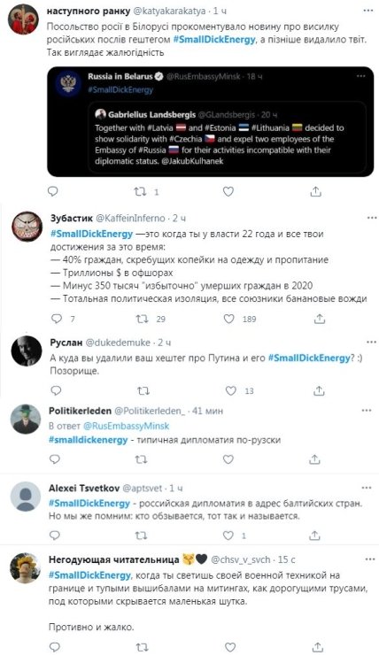 Посольство РФ в Минске ретвитнуло сообщение Ландсбергиса, сопроводив его тегом "#smalldickenergy", что дословно переводится, как "энергия маленького члена". Это выражение на сленге обозначает попытки кого-либо, кто ничего из себя не представляет, вести себя вызывающе и самоуверенно.