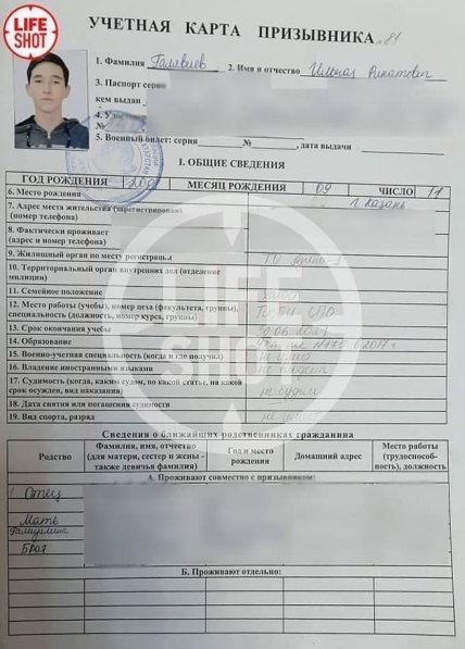 Интересно, что прошлым летом Галявиева должны были призвать в армию. Он получил отсрочку до 30 июня на время учебы, и ему необходимо было явиться в военкомат на медкомиссию в марте 2021 года. Но он не пришел. Руководству учебного заведения отправили повторную повестку - в военкомате не знали, что парня уже отчислили. На воинский учет Ильназ встал в 17 лет. На медкомиссии окулист выявил у него близорукость третьей степени, больше отклонений не обнаружили. Ему присвоили категорию годности Б-3 (годен с незначительными ограничениями).