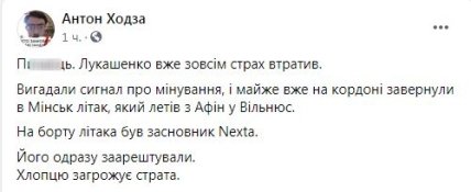 "Лукашенко уже совсем страх потерял. Придумали сигнал о минировании, и почти уже на границе завернули в Минск самолет, летевший из Афин в Вильнюс", - отметил блогер Антон Ходза.