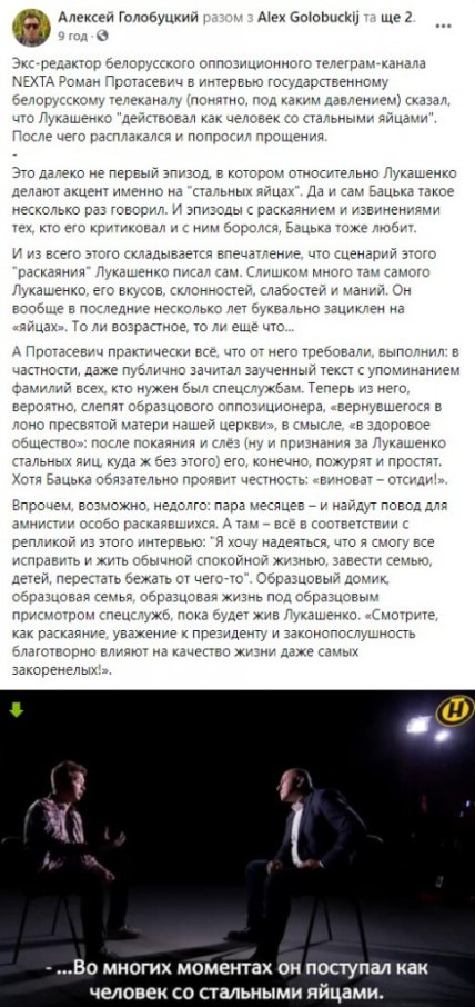 Политтехнолог Алексей Голобуцкий отмечает, что Протасевич "публично зачитал заученный текст с упоминанием фамилий всех, кто нужен был спецслужбам". По его мнению, из бывшего главреда NEXTA "вероятно, слепят образцового оппозиционера, "вернувшегося в лоно пресвятой матери нашей церкви", в смысле, "в здоровое общество": после покаяния и слёз (ну и признания за Лукашенко стальных яиц, куда ж без этого) его, конечно, пожурят и простят".