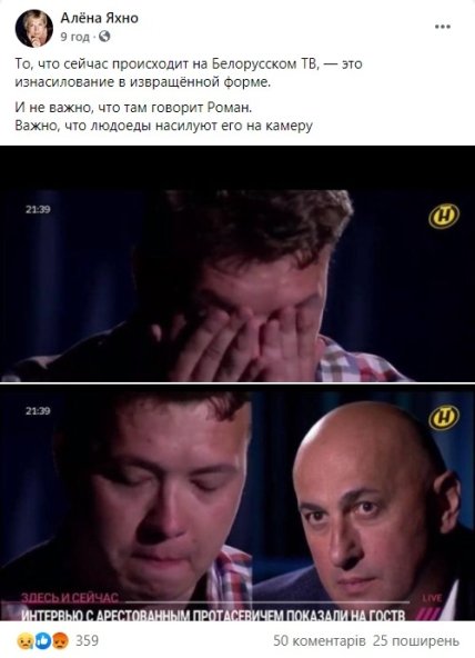 "К каким глубинам дна опустилась Беларусь ... Лысый жирный мясник берет "интервью" с заключенным Романом Протасевичем, который признается, раскаивается и плачет. Мясник даже не беспокоится, чтобы скрыть следы пыток у пленного. На сталинских публичных судах себя, свои семьи, любимых и друзей оговаривали и более прохаваннные люди, чем 26-летний Протасевич. Давно известно, что у лукашенковской гэбни 1937 год - на уровне памяти мышц. Но то, что ЭТО показывают в эфире, а Лукашенко до сих пор не получил своего черенка лопаты в задницу - вселенское зло", - пишет Даниленко на своей странице в соцсети Facebook в ночь на пятницу, 4 июня.