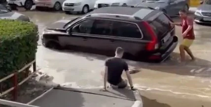 Во дворе жилого дома накануне произошел потоп, а потому блогер вышла перепарковать свой автомобиль. Когда она возвращалась домой, то услышала звуки сигнализации и мужчину плывущего в луже.