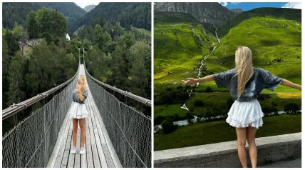 Новыми кадрами она поделилась в соцсети Instagram. По меньшей мере один из снимков снят на мосту Чарльза Куонена в восточной части долины Маттертал, который является самым длинным подвесным пешеходным мостом в мире.