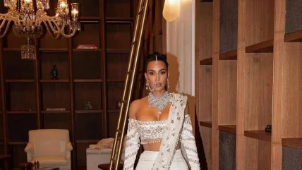 Также на роскошное событие Кардашьян одела эффектный наряд в индийском стиле. Костюм состоял из топа с длинными рукавами и юбки-рыбки, который подчеркнул аппетитную фигуру блогерки. Вся одежда была обшита золотыми полосками и узорами, что удачно выглядело на однотонной молочной ткани.