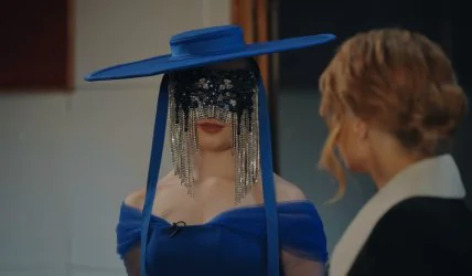 В этом шоу Klavdia Petrivna немного "оголила" себя. В видео она появилась в длинном приталенном платье синего цвета с открытыми плечами. Певица дополнила образ небольшой синей шляпой и маской со стразами и бахромой, которая прикрыла и одновременно немного открыла лицо. Видно, что у нее светлые волосы, которые были собраны в аккуратный пучок под шляпой. А еще голос — певица едва ли не впервые говорит своим настоящим голосом. И надо сказать, что по звучанию — это голос очень молодой девушки.