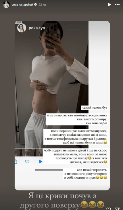 В сторис Инстаграма Екатерина, которая младше шоумена на 16 лет, рассказала о первом толкании малыша в животике и как ее это шокировало. Также блогерша призналась, что часто информирует о новых радостях беременности своих близких и подруг. Поэтому возлюбленная Остапчука подозревает, что, наверняка, уже всем надоела.