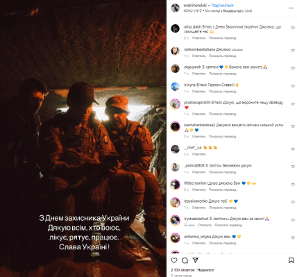 Лидер группы O.Torvald Женя Галич, занимающийся материально-техническим обеспечением ВСУ, поздравил защитников и защитников сообщением в Instagram. "Мой выбор, моя ответственность! С праздником, родные! Вечная слава Героям. Вечная память ангелам, отдавшим свою жизнь за будущее. Честь", — написал певец в сообщении.