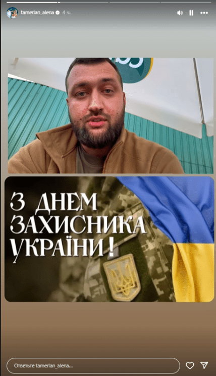 Слова благодарности также выразил певец Тамерлан, присоединившийся к рядам ВСУ как доброволец. Он записал разговорную страницу. "Хочу поздравить с Днем защитника Украины всех, кто сейчас защищает нашу мать, всех, кто стоит на защите, всех, кто работает ради нашей победы и делает все для того, чтобы было чем воевать", — поздравил Тамерлан.