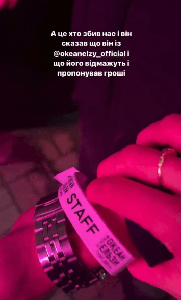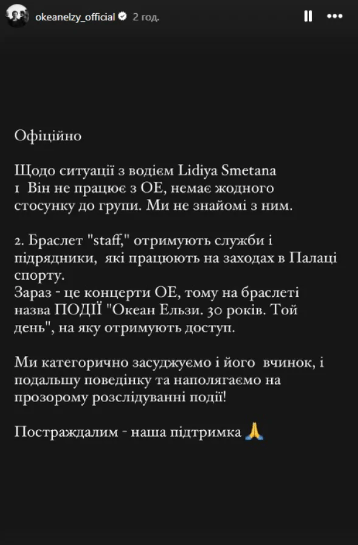 На своей странице в Instagram в stories группа "Океан Эльзы" опубликовала сообщение, в котором осудила поведение мужчины, заявив, что он не имеет к их команде никакого отношения.