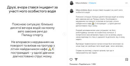 Когда история получила огласку, на странице в Instagram Лидия Сметана опубликовала пост, в котором рассказала, что виновником ДТП стал ее личный водитель. По ее словам, он не справился с управлением и влетел в терассу. Правоохранители, прибывшие на место ДТП, провели необходимые тесты, в частности на содержание алкоголя в его крови, которые показали отрицательный результат.