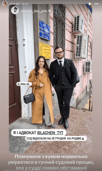 В среду, 30 октября, Инна Мирошниченко и Евгений Пронин должны были "ворваться" в громкий процесс, в котором блогера Лачена обвиняет журналистка запрещенного в Украине издания "Страна". "В судье семейные обстоятельства… Суд отложили на 25 декабря. На Рождество", — сообщили Инна и Евгений.