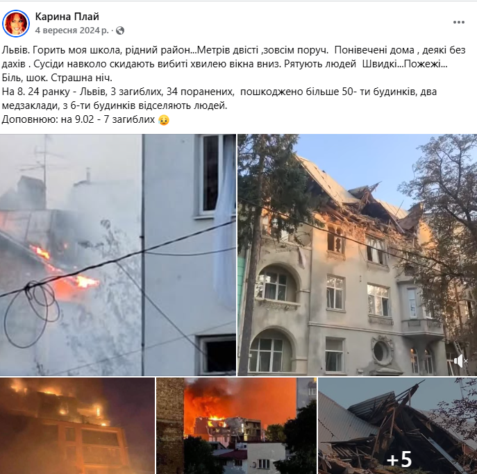 В сентябре 2024 Карина Плай прокомментировала удар беспилотниками по жилым зданиям Львова. Тогда пострадал район, где родилась певица.